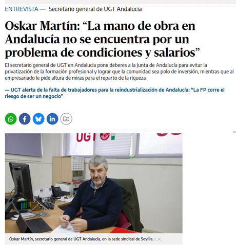 29/01/2026 - El secretario general de UGT Andalucía, Oskar Martín, ha participado hoy en el Comité Constituyente de FESMC UGT Andalucía celebrado en Málaga, donde ha trasladado el respaldo de la Comisión Ejecutiva Regional a la federación y ha marcado las prioridades sindicales para los sectores de servicios que sostienen la vida cotidiana y la economía andaluza. En dicho comité, en el que participan más de 100 delegados y delegadas de toda Andalucía, también ha estado presente el secretario general de la federación, Antonio Oviedo. Leer más. subir