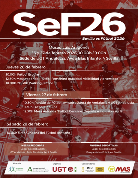25/02/2026 - Desde este jueves 26, al sábado 28 de febrero, tendrá lugar una nueva edición de Sevilla es Fútbol (SeF26). Organizada por UGT Andalucía, con el apoyo de la Consejería de Inclusión Social, Familias e Igualdad, de la Junta de Andalucía, trae un amplio programa de actividades, teniendo como eje transversal el fútbol, pero aunando los principios de igualdad de género y la inclusión de las personas con discapacidad, así como destacando otros aspectos como la cultura, la salud o el ocio. Leer más. subir