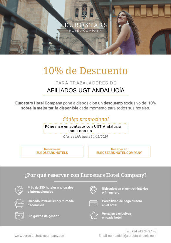 DESCUENTO 10% PARA AFILIADOS/AS UGT ANDALUCIA EN HOTELES EUROSTARS - CARTEL INFORMATIVO HOTELES EUROSTARS Y CÓDIGO AFILIADO/A