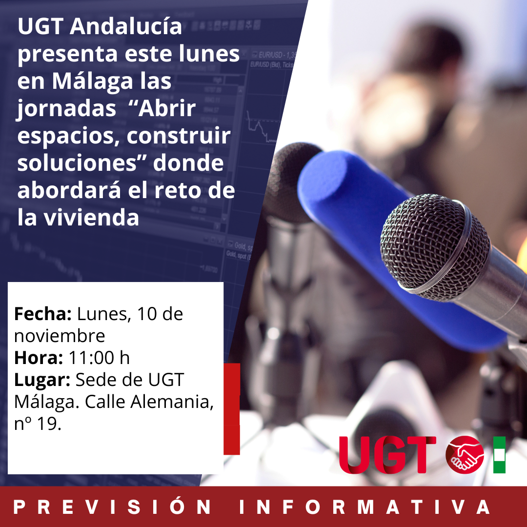 07/11/2025 - Este lunes, a las 11:00 horas, UGT ofrecerá una rueda de prensa previa al inicio de las jornadas que organiza UGT en Málaga que se titulan "Abrir espacios, construir soluciones. Más y mejor sindicato", que se celebrarán los días 10, 11 y 12 de noviembre, un encuentro que reunirá a responsables sindicales, expertos y representantes institucionales para abordar el reto de la vivienda digna y las políticas públicas necesarias para garantizarla. Leer más. subir