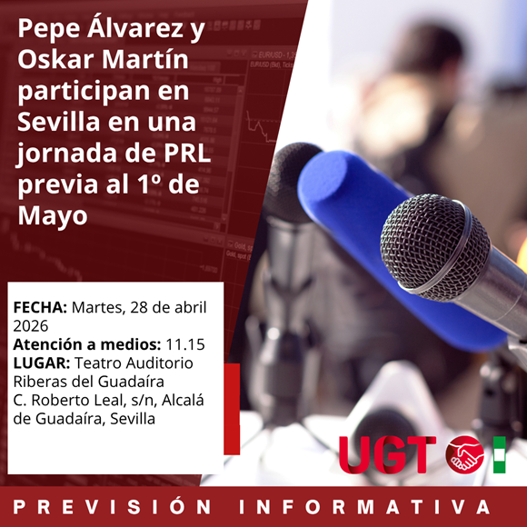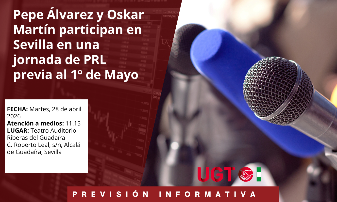 Este martes, 28 de abril, en el Teatro Auditorio Riberas del Guadaíra de Alcalá de Guadaíra (Sevilla), se celebrará una jornada de PRL de delegadas y delegados del sindicato en la que participará el secretario General de UGT , Pepe Álvarez, el secretario General de UGT Andalucía, Oskar Martín y la candidata del PSOE a la Junta de Andalucía, María Jesús Montero.