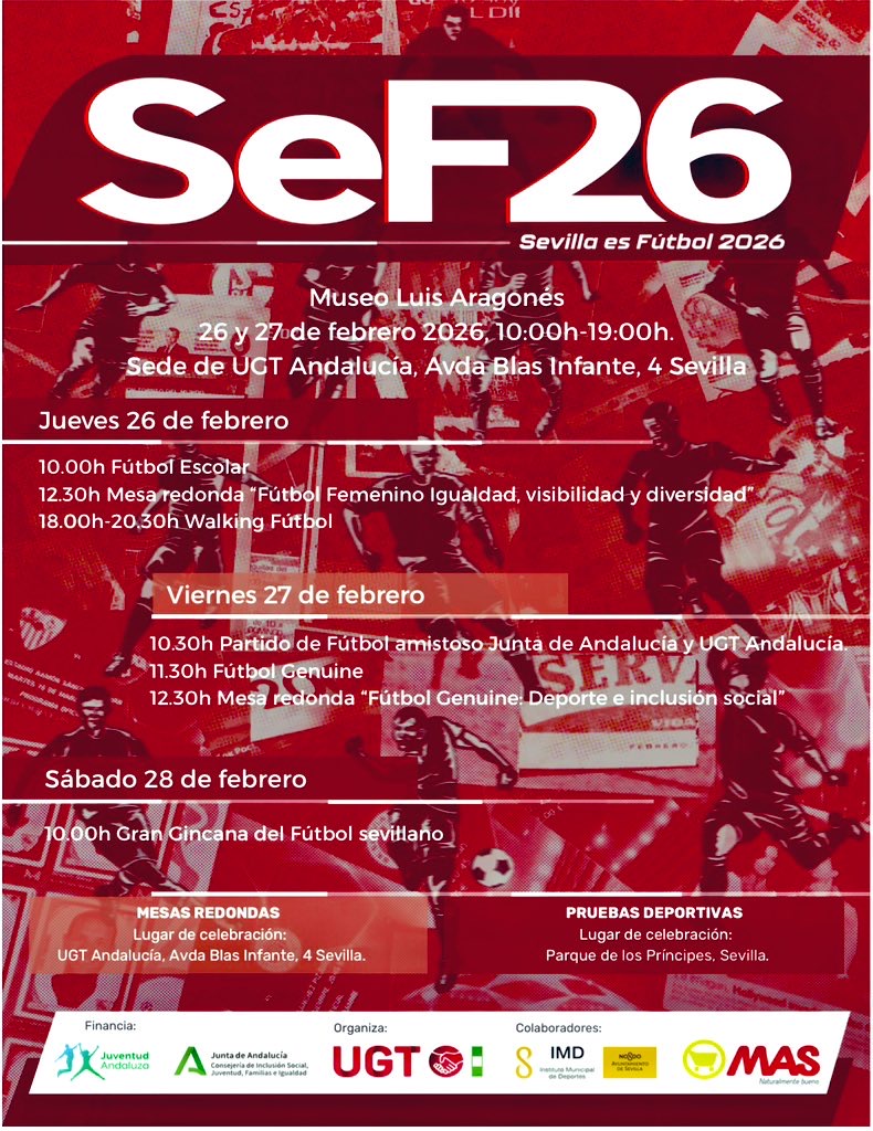 23/02/2026 - Este SeF26 traerá a los aficionados y aficionadas del «deporte rey» un amplio programa de actividades que, teniendo como eje transversal el fútbol, aunará aspectos como cultura, ocio, salud, igualdad e inclusión. En esta ocasión, Sevilla es Futbol 2026 está organizada junto a UGT Andalucía, enmarcándose dentro de sus acciones como son: la defensa de la igualdad de oportunidades y la inclusión social de las personas más vulnerables. Estas actividades están destinadas sobre todo a jóvenes y personas con discapacidad, promoviendo la igualdad de género, la diversidad y la cohesión social a través del deporte.