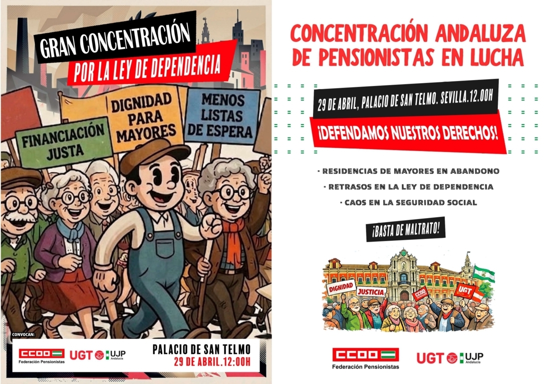 Bajo el lema ‘La atención a la dependencia es un derecho’, la Unión de Jubilados y Pensionista (UJP) de UGT ha convocado una movilización a nivel andaluz el 29 de abril ante el Palacio de San Telmo, en Sevilla, para denunciar la situación dramática que sufren miles de personas en Andalucía ante la política privatizadora del Gobierno andaluz. En Granada unas 5.000 personas permanecen atrapadas en la lista de espera, con un tiempo medio de resolución que alcanza los 565 días, una cifra que triplica el plazo legal de 180 días.