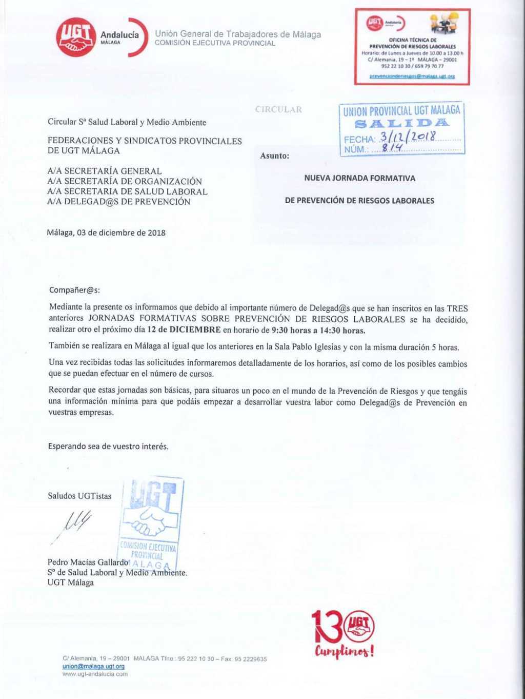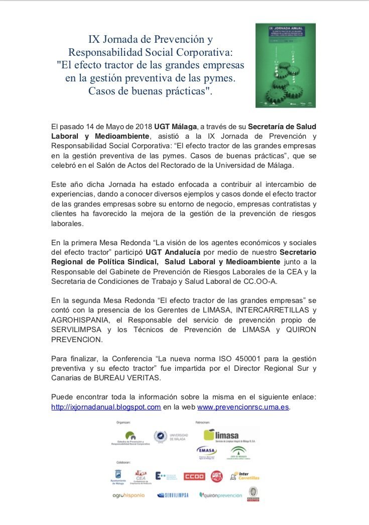 27/09/2017 - Con el objetivo de fomentar la Cultura Preventiva en el trabajo, desde UGT Málaga, hemos tomado este año 2017 como Año de la Prevención de Riesgos, en el cual focalizamos mes a mes los distintos aspecto que afectan directamente a la siniestralidad laboral en nuestra provincia, basándonos prioritariamente en unas cifras que por desgracia no dejan de aumentar. Leer más. subir