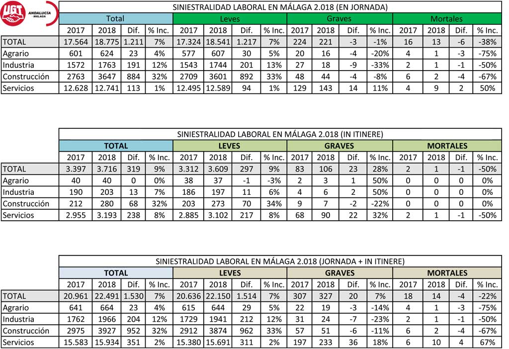 01/02/2017 - UGT Málaga denuncia 18.679 accidentes laborales con baja en la provincia de Málaga, 15.681 en jornada de trabajo y 2.998 in itinere, lo que supone respectivamente un aumento del 4,8 % y del 5,6% en 2016, en relación a 2015. En términos absolutos, el Secretario de Salud Laboral y Medio Ambiente Francisco Javier Rodriguez Hurtado apuntó que los accidentes laborales aumentan un 5% en nuestra provincia. Analizando los distintos sectores, es en Servicios, con 14.258 accidentes y un aumento del 6,2%, donde está el grueso de accidentes, seguido de Construcción con 2.287 accidentes y un ascenso del 10,6 %. Los Sectores Agrario e Industria son los que reducen levemente sus cifras con un total cada uno de 482 y 1.652 accidentes. Leer más. subir